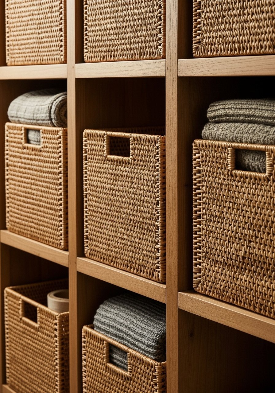 Baskets saved my shelves. I no longer see random chargers and kids’ drawings. A medium rattan basket hides what I don’t want on display and still reads warm.