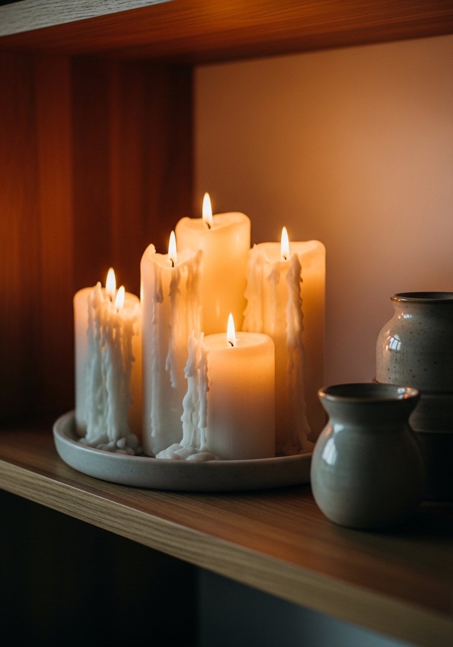 Candles add instant warmth on a shelf. I group two or three pillar candles on a shallow tray and it reads like a little vignette.
