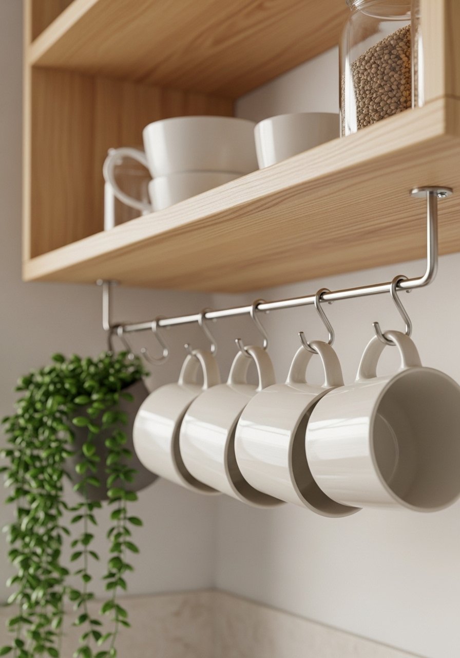 At first I used heavy mugs and the hook bent. Choose sturdy hooks and space them evenly. This is inexpensive and renter-friendly if your shelf can handle the load.