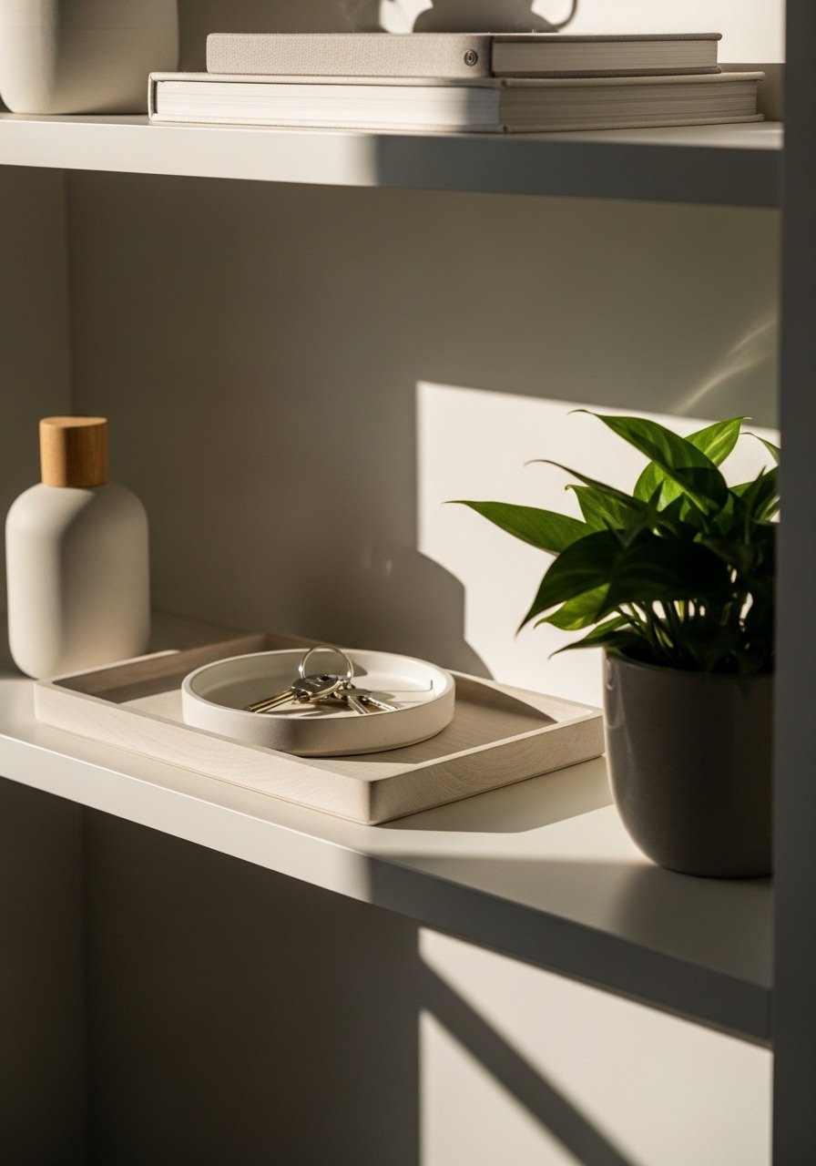 I made an entry shelf with a shallow tray for keys, sunglasses, and mail. It cut down the pile on the console table and looks tidy.