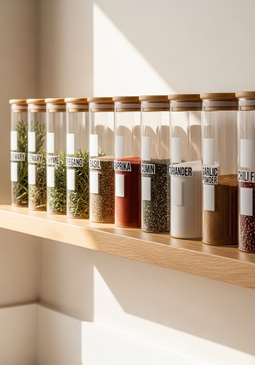 I decanted spices into matching clear jars and lined them neatly on a shelf. The uniform look is calm and practical.
