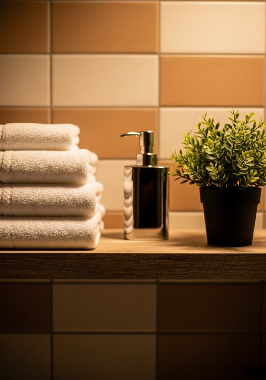 My early mistake was over-decorating with small bottles. Minimal towels and one tray keep things useful. Rotate towels frequently to keep the shelf tidy.