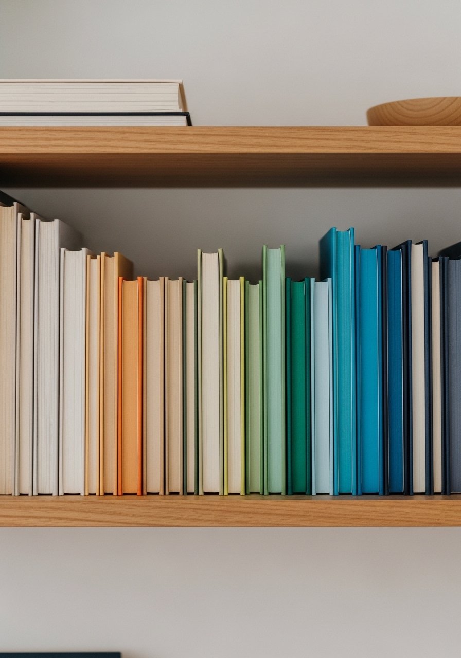 I rearranged books by spine color and the shelf went from messy to sculptural. The gradient creates a soft, peaceful band across shelves.