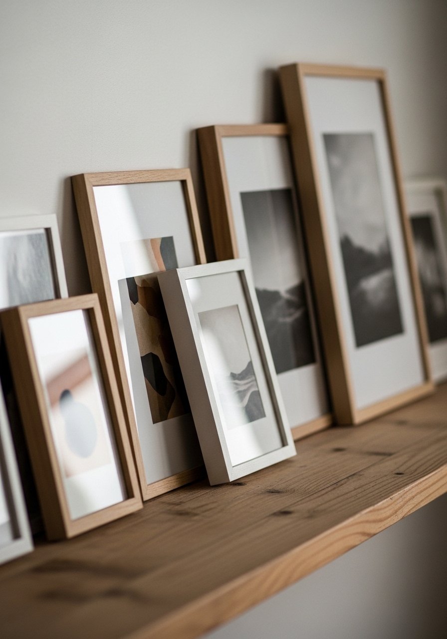 Leaning framed art on a shelf gives an instant gallery feel without nails. I layered a medium frame behind a small sculpture and it felt layered and lived-in.