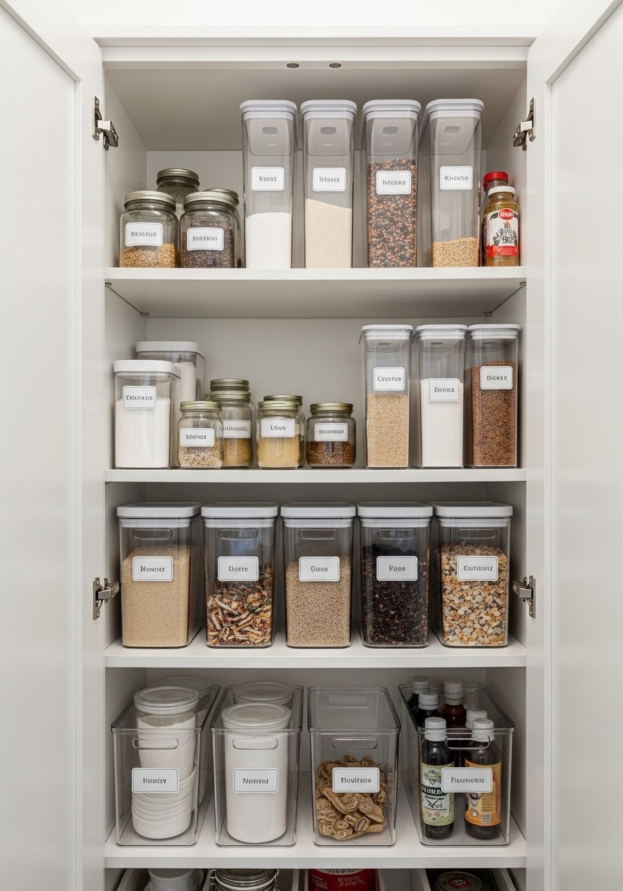 I organized pantry shelves with clear bins and labeled compartments. Meal prep is faster and the shelves don’t look chaotic.