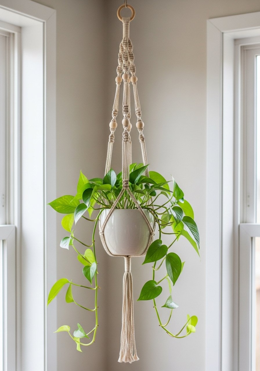 I made a simple macramé hanger using 3/8-inch cotton rope and a 6-inch ceramic pot to bring height into my corner. It creates a layered, organic feel that pairs well with warm wood tones. I hung this realistic trailing pothos and it reads fresh. Mistake to avoid: using thin cord that sags — pick sturdy rope and keep knots tight for a clean, minimalist finish.