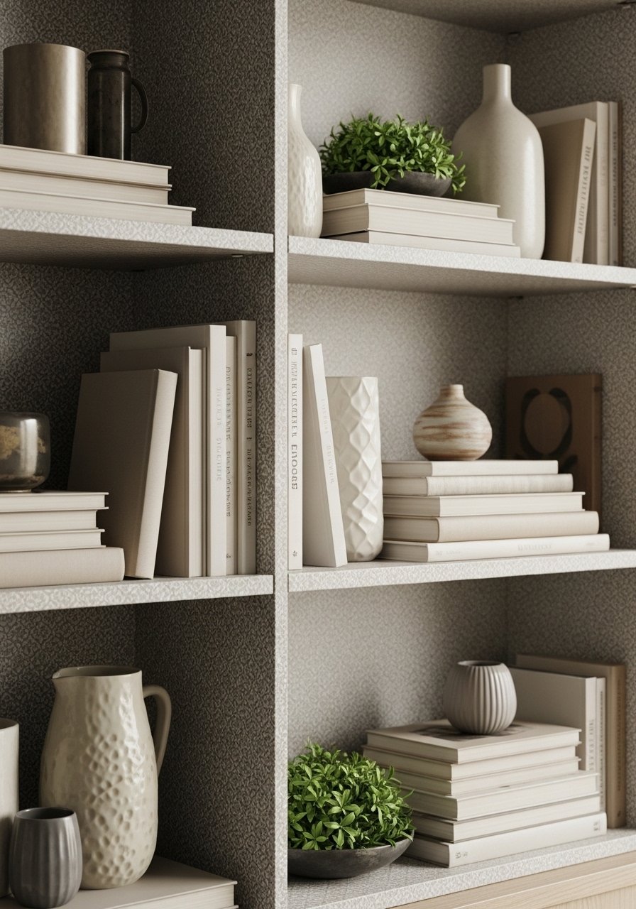 I used peel-and-stick panels on the back of my white oak shelves to add subtle pattern without commitment. It makes books and ceramics pop and reads like a budget-friendly built-in. I recommend neutral peel-and-stick wallpaper panels in a soft linen texture. Mistake: matching the pattern scale to shelf depth — choose small-scale prints for narrow shelves so styling doesn’t look busy.