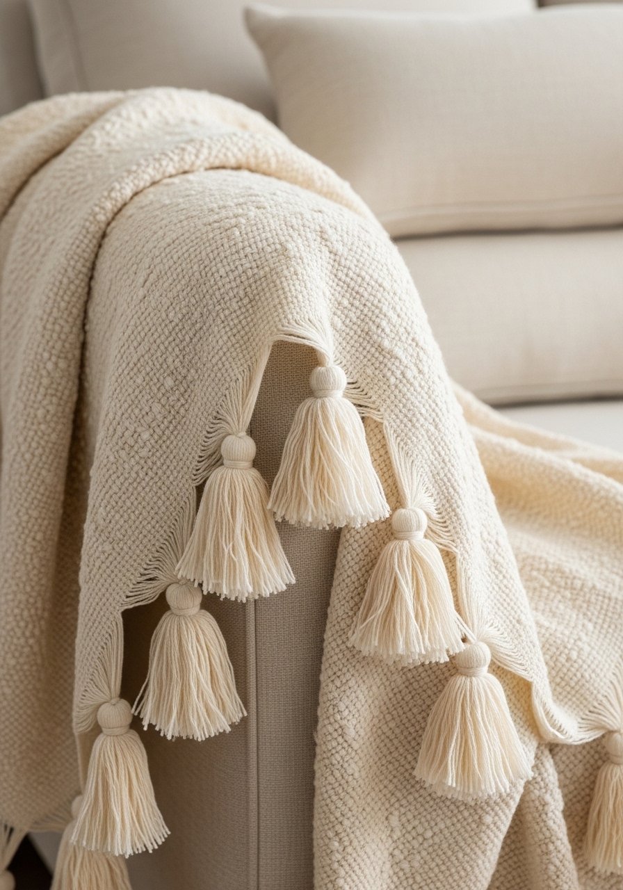 I added handmade tassels to a plain cream throw and suddenly the sofa felt layered and edited. Tassels are an easy way to bring tactile interest—especially paired with linen pillows and warm neutrals. I used this cream chunky knit throw as a base. Mistake to avoid: making tassels too large for a small sofa; keep them proportional and secure the knots so they endure real use.