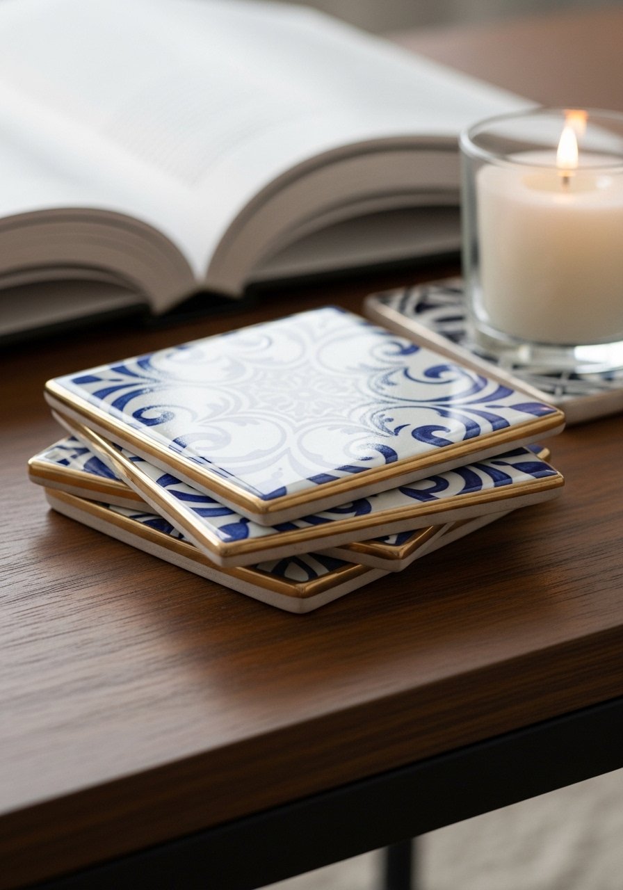 Ceramic Tile Coasters with Gold Trim for Coffee Tables
