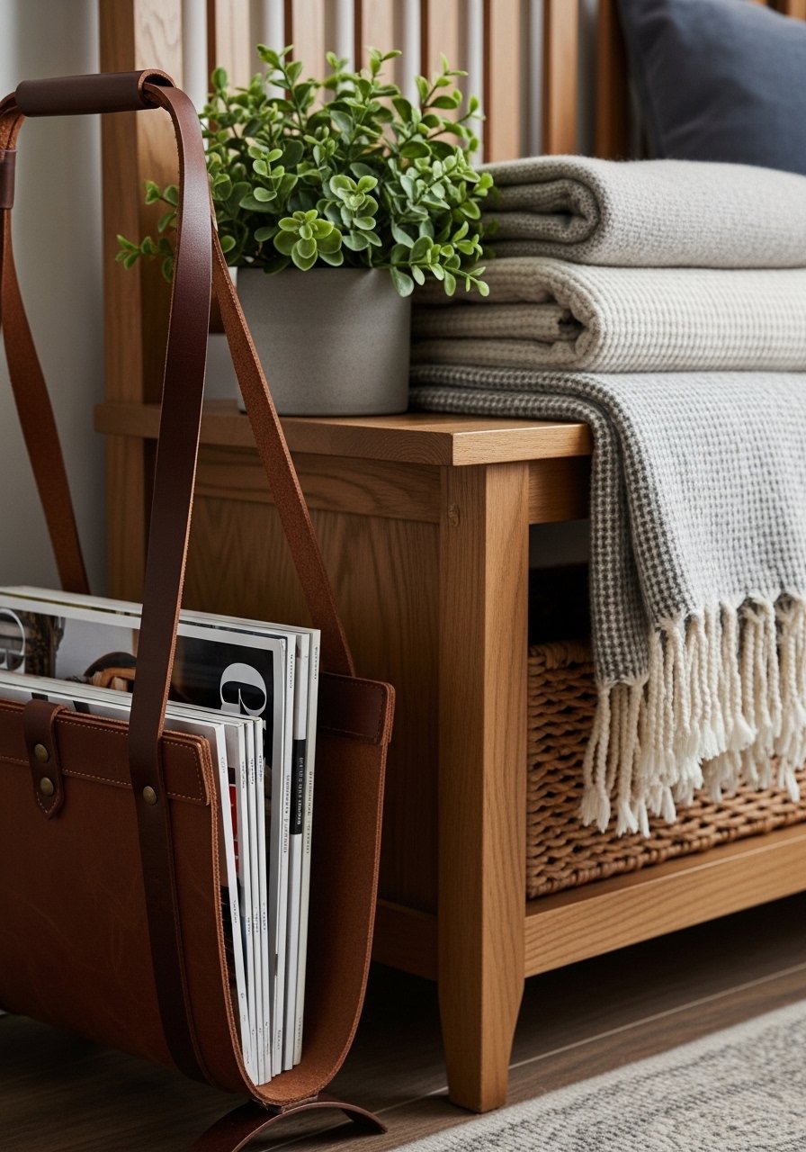 I made a simple holder by attaching two leather straps to a wooden dowel — it corrals mail and notebooks and reads modern-rustic. Use vegetable-tanned leather for warmth. I pair it with a small 6ft artificial fiddle leaf fig to anchor the corner. Mistake to avoid: straps too short — allow enough drop so magazines don’t bend. This adds storage without visual clutter.