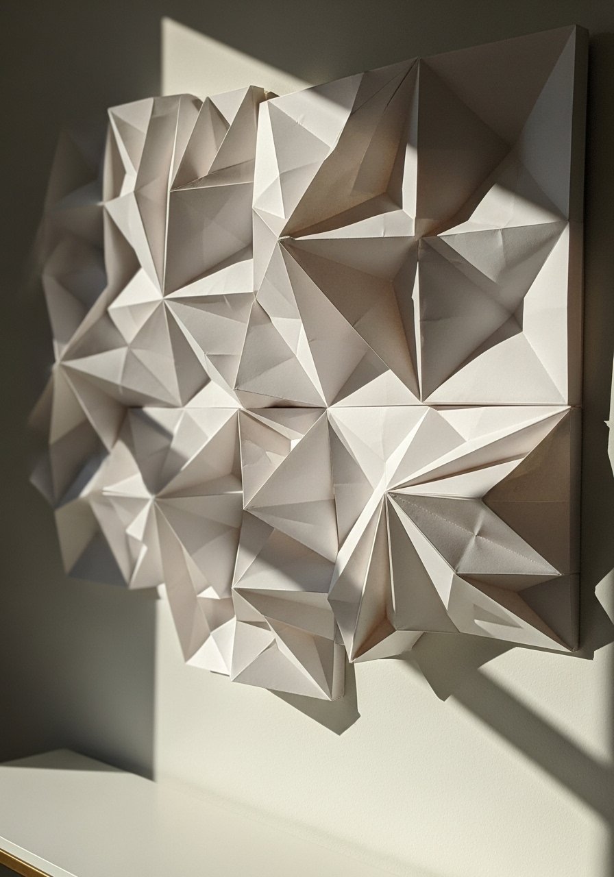 I folded heavyweight paper into simple geometric fans and mounted them in a cluster for a 3D wall piece that reads like art. It’s a low-cost way to bring dimension; I used neutral card stock in cream and warm gray. I framed the cluster with a slim 36-inch round mirror nearby for added light. Mistake to avoid: spacing pieces too evenly — slight irregularity makes it feel intentional and modern.