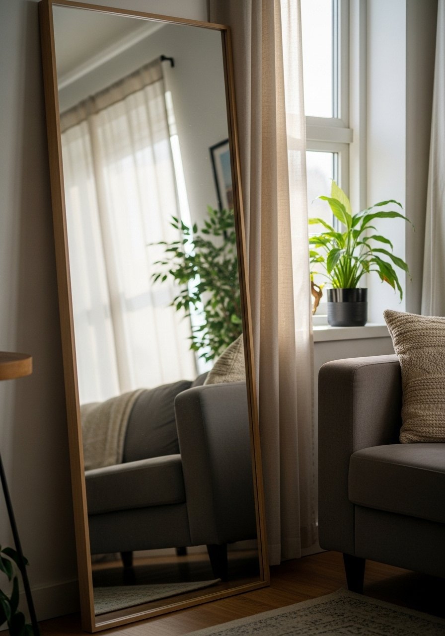I bought a 48×72 mirror and leaned it behind my sofa. The room felt twice as deep. Lesson learned: don’t hang it too low. I once anchored one at chair-back height and it chopped the vertical space.