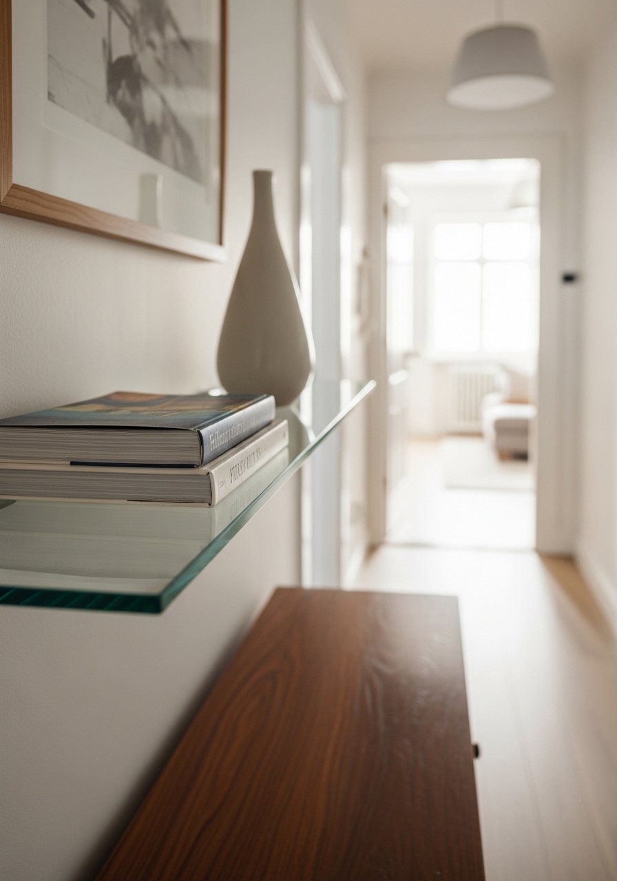 I installed glass floating shelves above my slim console to display a few ceramics. They let light pass through and the wall felt less heavy. My first set sagged because I overloaded them with trophies — lightweight objects only.