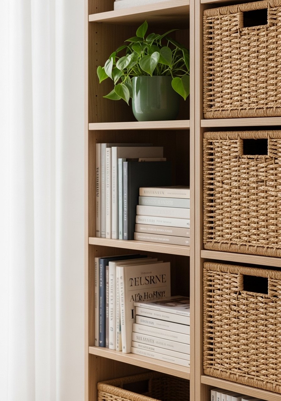 Open shelving helped me display the things I love. But I also used woven baskets for the ugly but necessary clutter — chargers, remotes, and receipts. I tried an all-open route and it read chaos within two weeks.