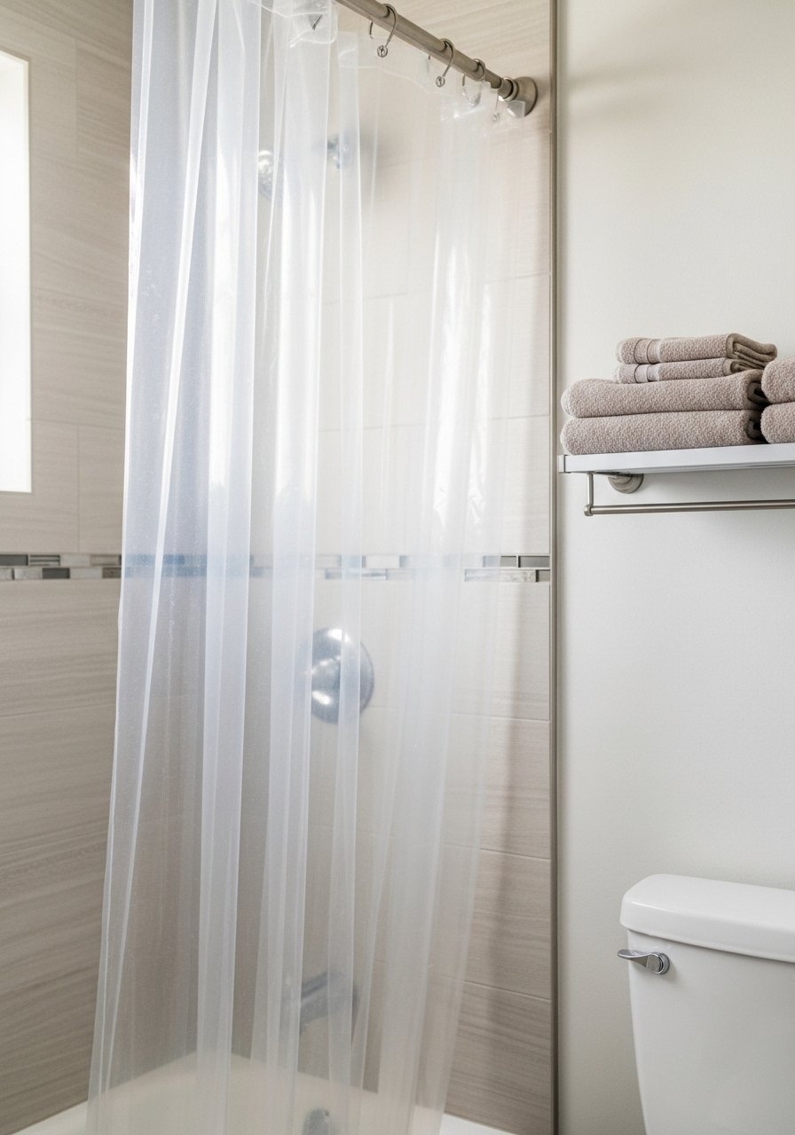 In my tiny bathroom I switched to a clear shower curtain and added one floating shelf for essentials. The room appeared larger because the shower didn’t form a visual wall. I once used patterned curtains and the space shrank.