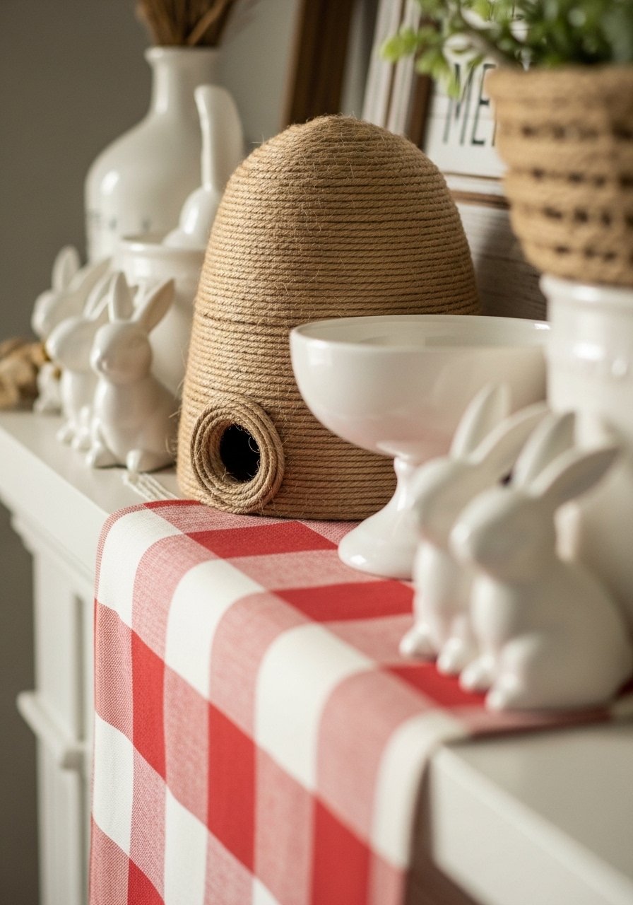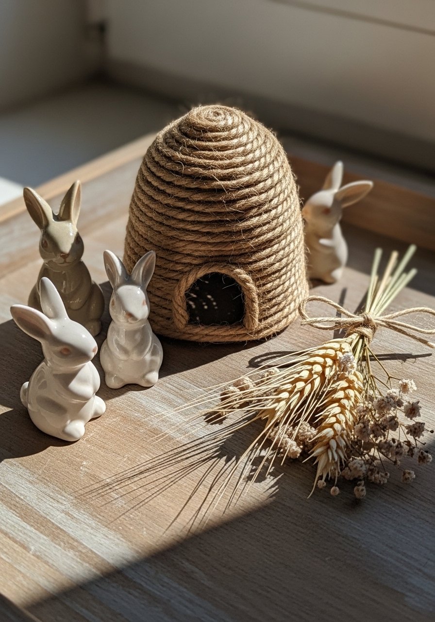 Adding a twine beehive gave my mantel a rustic focal point without clutter. I paired it with a small ceramic bunny and a dried bouquet. A decorative twine beehive is unexpected but grounded. Avoid using too many small accents that fight each other; one textural piece plus two supporting items is enough. This brings natural textures and a cozy spring mood that reads hand-collected rather than staged.
