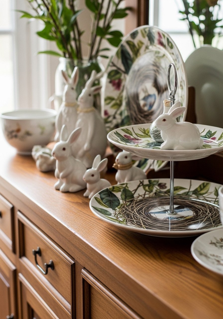 I styled a sideboard with a decoupage bird nest plate and a three-tiered stand stacked with little nests and petite ceramics. I found similar charm with this decorative tiered stand and added thrifted plates for texture. The look is playful but still refined—great for Easter touches without overwhelming the room. One mistake: double-check scale. Small plates get lost on a large sideboard, so cluster items near a lamp or mirror for balance.