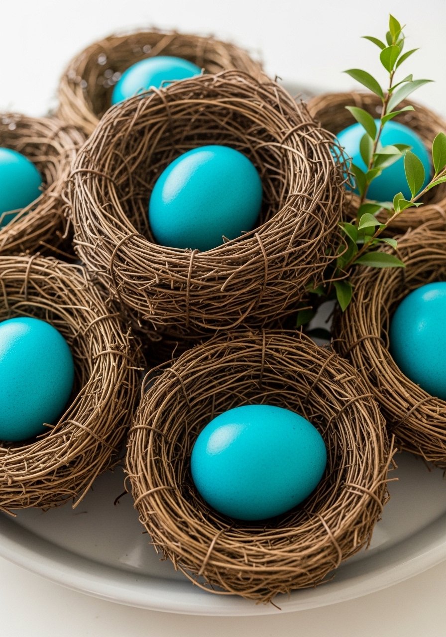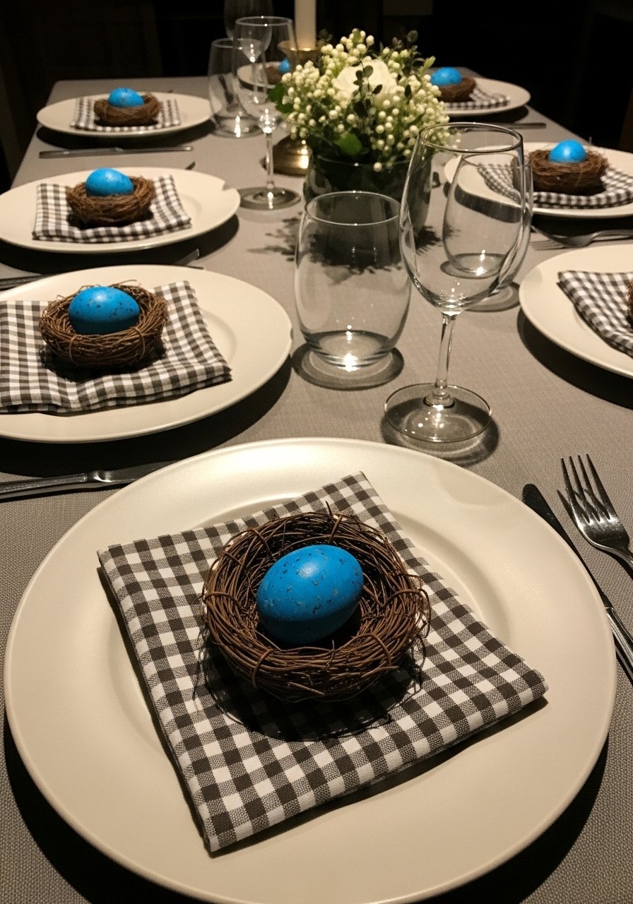 For a sweet, casual table I tuck little nests with blue eggs into place settings. I grabbed faux nests and painted eggs from JOANN and finished with gingham napkins. Small bird nests add personality without cluttering the table. Keep each setting simple and avoid oversized centerpieces that compete with the nests. This approach feels seasonal without being overly themed, ideal for spring dinners and casual brunches.