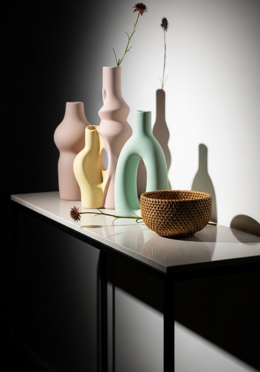 I collected sculptural ceramics in soft pastels and grouped them on my console. A pastel sculptural vase adds subtle artistry without overwhelming the space. Keep the base neutral and limit to three pieces for a clean, airy look. Avoid tiny knickknacks that distract—the sculptural forms should be the star. This reads modern and intentional; it’s especially effective in narrow entryways where texture and shape matter most.