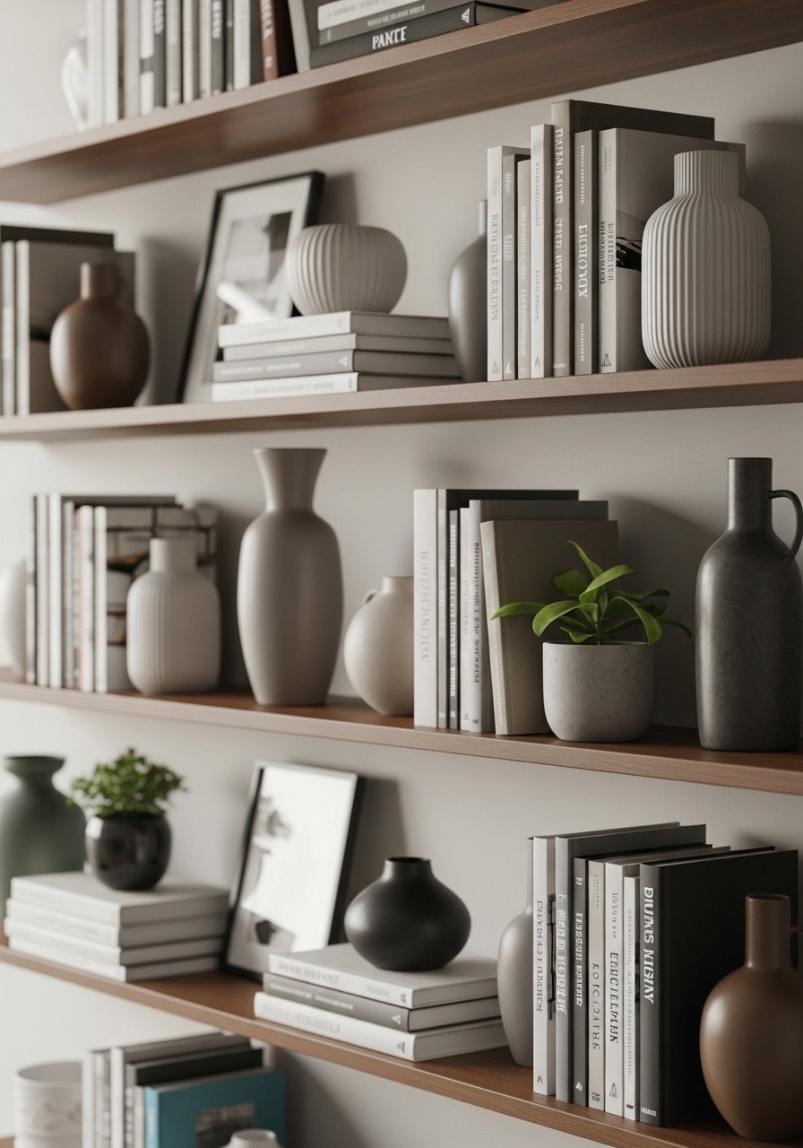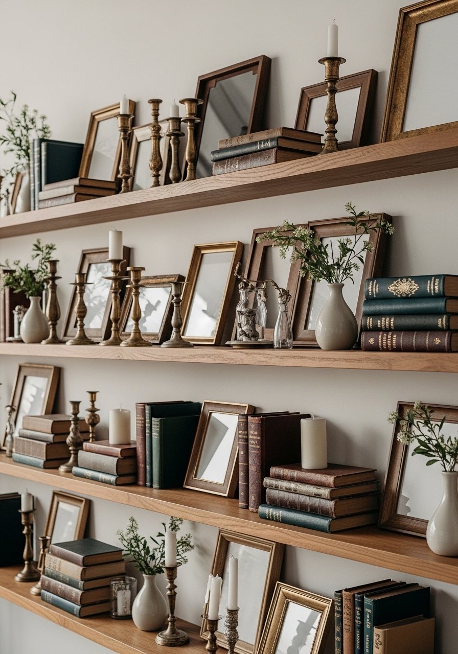I styled shelves by alternating books, framed photos, and greenery in small vases to achieve layered depth. I used small glass bud vases and varied heights with stacked books. Odd-number grouping and negative space keep things from feeling flat. One mistake is lining items up symmetrically—stagger them for a curated look. This technique also answers the common problem of flat shelves that need visual drama.