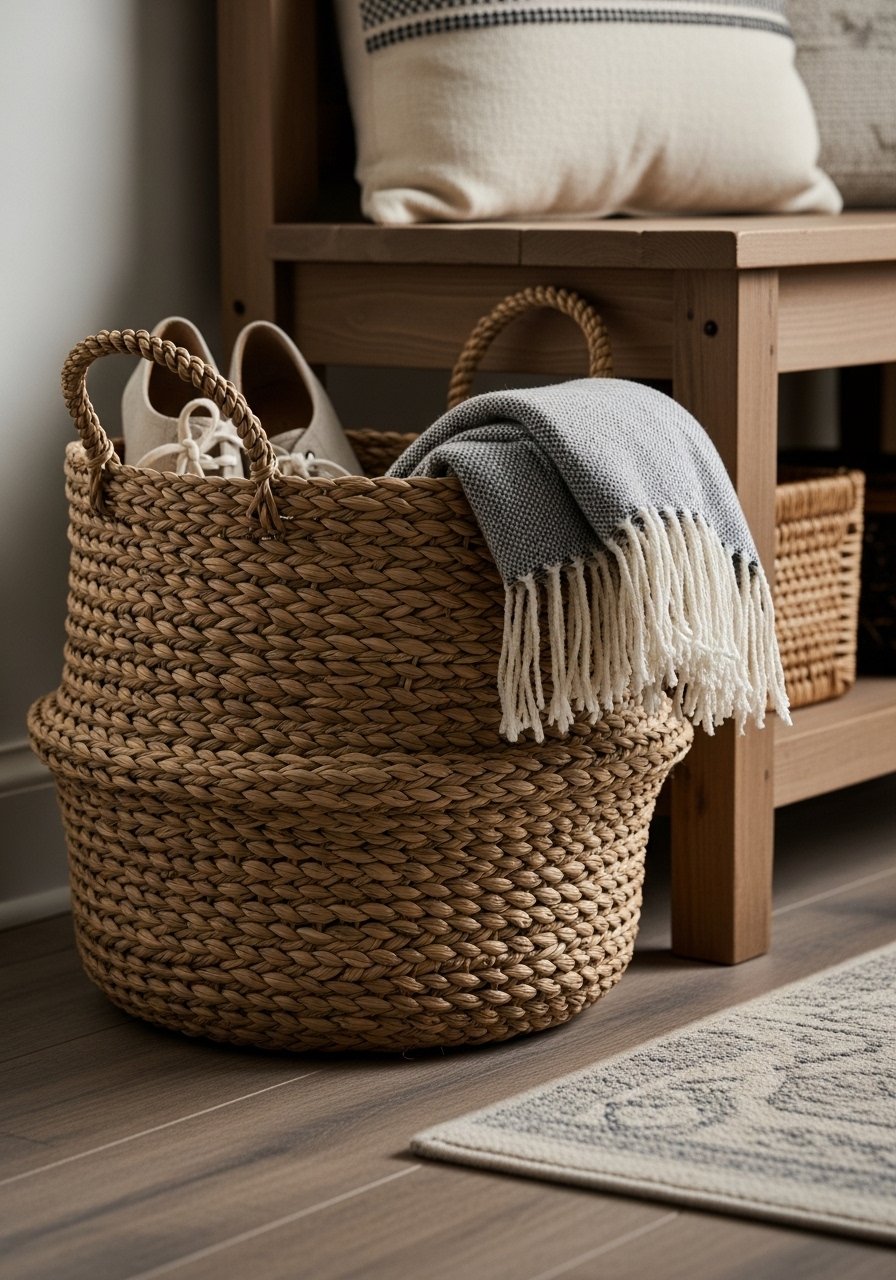 I kept only one large rattan basket by the door and everything immediately felt tidier. A large woven storage basket hides shoes, leashes, and umbrellas while adding texture. The basket doubles as decor, so choose one with a nice weave and neutral tone. Don’t use multiple small bins—one oversized basket keeps the area from feeling cluttered. This simple swap solved the “cold, uninviting entryway” I used to have.