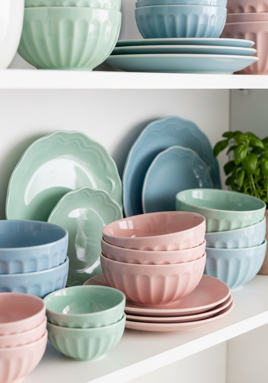 My kitchen shelves felt calmer once I removed clutter and displayed a small collection of pastel ceramics. A set of pastel mixing bowls adds color without clutter. Group by color and vary heights with a plate stand or small book. Don’t overfill shelves—leave negative space so each sculptural ceramic piece can be appreciated. This is an easy way to introduce soft pastels and subtle artistry into everyday spaces.