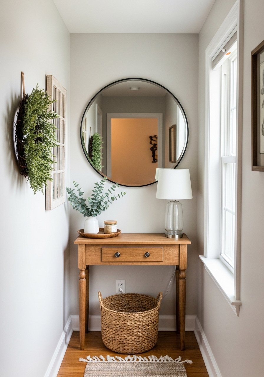 I hung a 36-inch round mirror above a slim console and added a small wreath to the side. A 36-inch round mirror reflects light and opens the space. Pairing mirror and wreath gives immediate personality and prevents a narrow hall from feeling like a tunnel. One mistake is picking a mirror too small for the wall—aim for scale. This makes a tight space feel airy and welcoming.