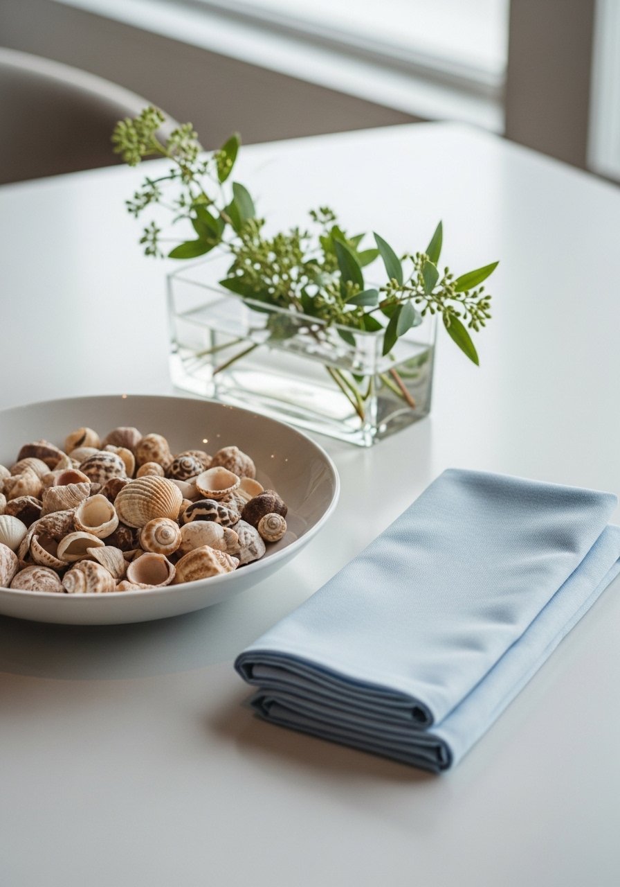 I brought a touch of the coast indoors with a shallow bowl of shells, pale blue napkins, and a cream vase. A shallow decorative bowl filled with shells reads fresh and seasonal. Keep the palette muted to avoid looking themed. A frequent mistake is mixing too many beach items—stick to one or two coastal hints. This adds airy textures and soft pastels ideal for spring that nod toward summer.