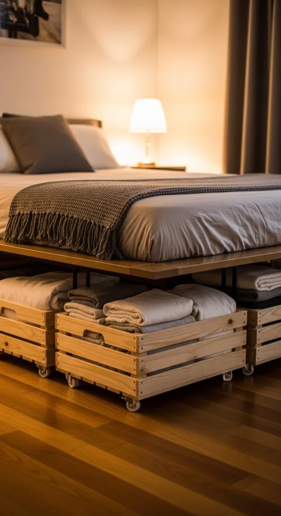 The space under your bed often goes unused. Turn it into hidden storage with DIY rolling bins. Attach wheels to wooden crates or sturdy plastic boxes. Slide them in and out easily.