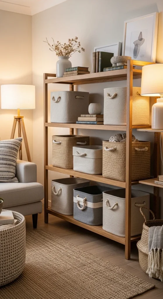 Store luggage, books, or seasonal decor in baskets. Items stay accessible yet hidden from daily view.