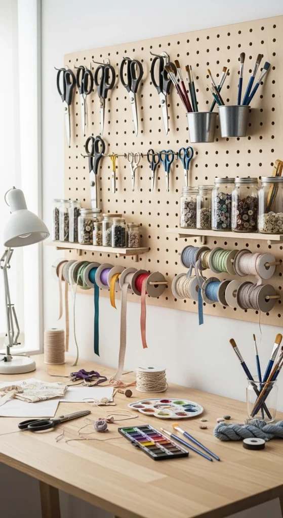 A pegboard turns cluttered craft supplies into a tidy display. Hooks, baskets, and shelves can hold everything from scissors to paint bottles.