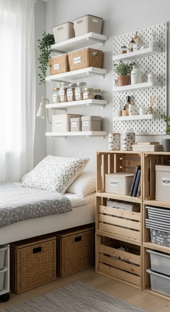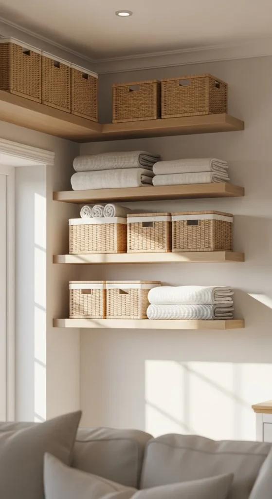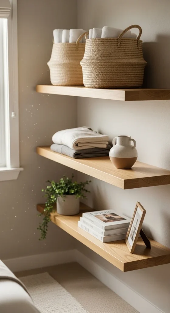 Floating shelves provide vertical storage while keeping surfaces free. Use baskets to store clothes, linens, or accessories.
