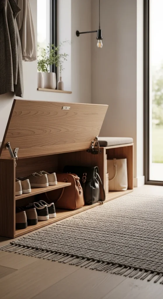 A storage bench doubles as seating and a hidden storage spot. Lift the hinged top to store shoes, bags, or seasonal gear.