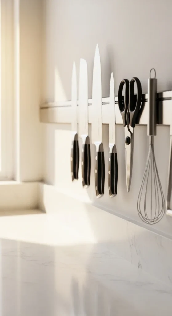 Magnetic strips create vertical storage for metal items like knives, scissors, or tools. Counters stay clear, and items are easy to grab.