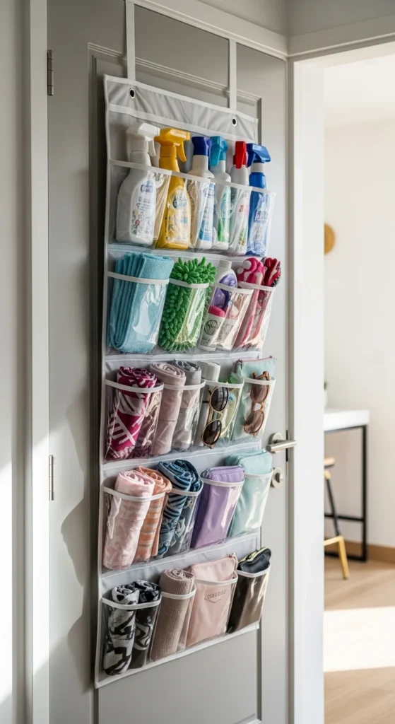 Budget tip: repurpose an old shoe organizer or stitch pockets onto fabric. This solution instantly frees up cabinet space and keeps frequently used items within reach.