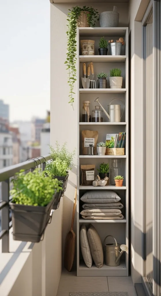 Even small balconies can have organized storage. A slim cabinet holds tools, cushions, or planters without taking much space.