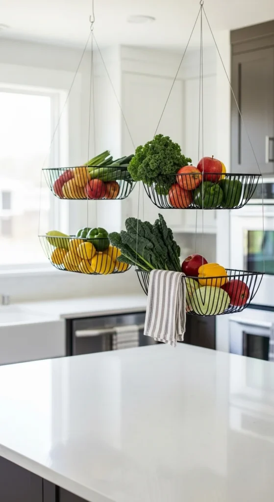 Use hanging baskets to free counter space. They store fruits, veggies, or even utensils.