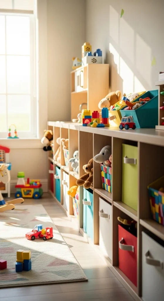 Budget tip: add labels or color-code bins for quick cleanups. Cheap fabric bins and cube shelves grow with the child’s storage needs and make organizing playrooms simple.