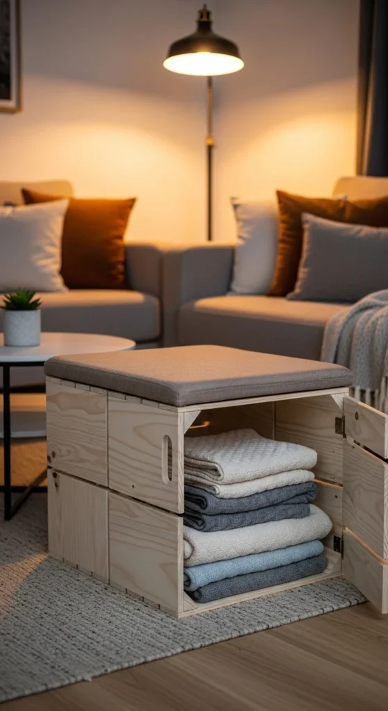 Budget tip: repurpose an old coffee table or crates, add a cushion on top, and paint to match decor. It’s a quick fix that hides mess while serving a practical purpose.