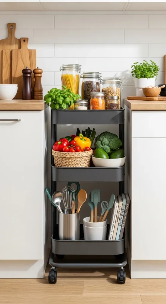 Budget tip: repaint an old cart or add baskets to cheap metal versions. Wheels make cleaning easier too. Small homes benefit from storage that moves instead of staying fixed.