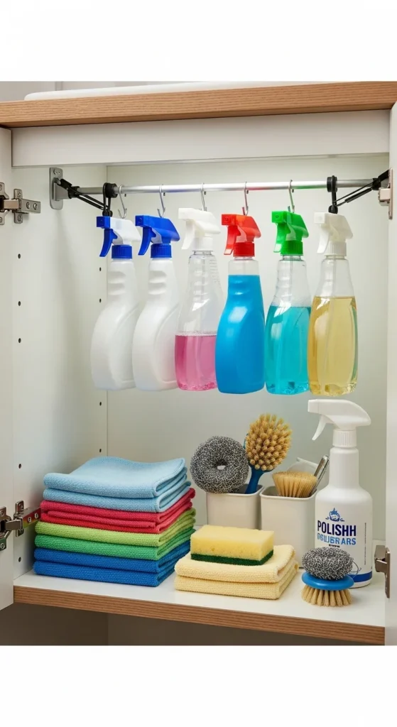 Budget tip: tension rods are inexpensive and adjustable. Add small hanging baskets for sponges or gloves. A five-minute setup clears messy cabinets quickly.