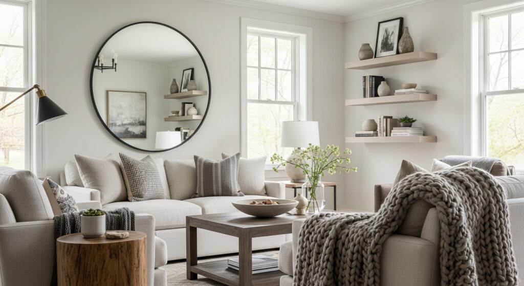 I swapped a narrow mirror for a large round one and the hallway felt wider instantly. Mirrors open sightlines. Choose at least one-third the width of the wall for impact. Best for entryways, narrow halls, bathrooms. Budget $80 to $150. I used a 36-inch round mirror. Avoid ornate frames that fight your decor. In photos mirrors can look perfect. In real life check for distortion.