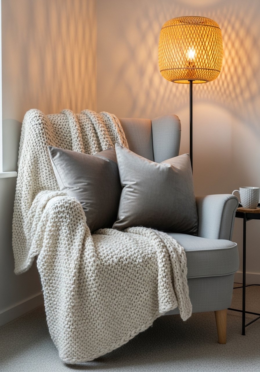 The moment I draped a chunky throw over my gray armchair, the whole corner stopped looking staged. For a reading nook aim for 3 pillows in odd numbers and one chunky texture. Works best in a bedroom or living room. Budget can be $40 to $120. I used this cream chunky knit throw and two velvet pillow covers. Avoid tiny pillows that disappear. In photos you want perfect fluff. In real life, mess it up a little.