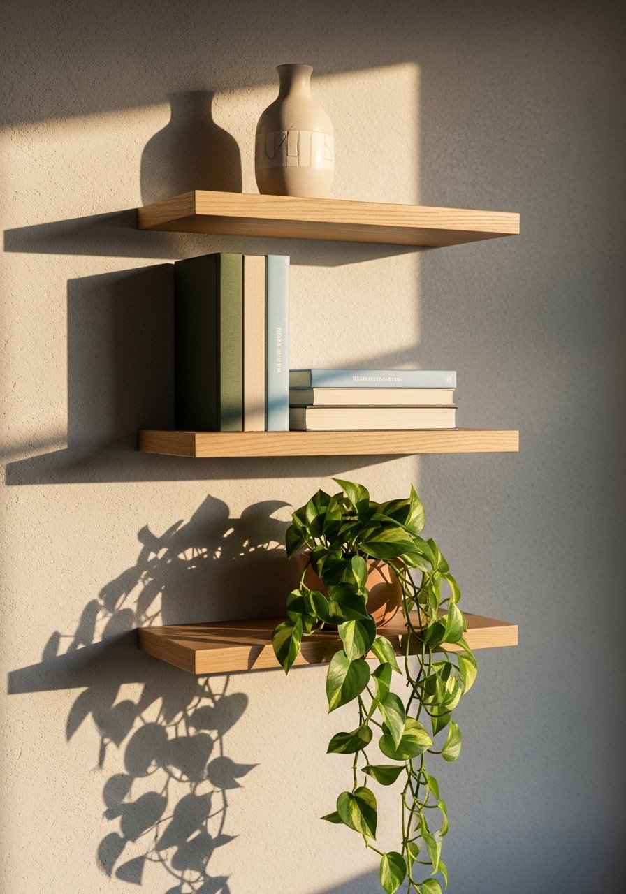 - Set of 3 floating shelves, white oak (~$45-70). Stagger the heights for visual interest