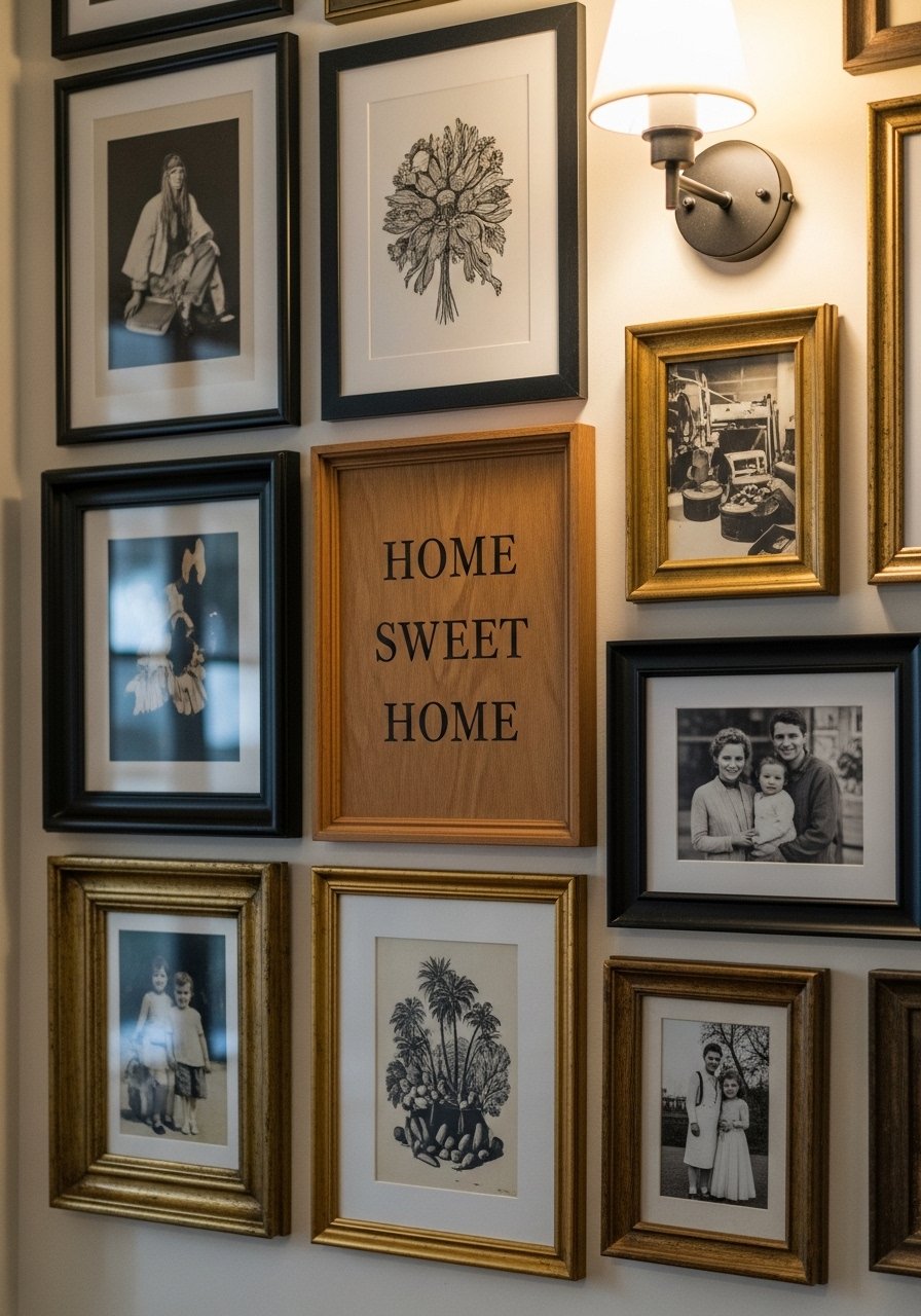 My gallery wall began as thrift store finds. Mixing frames makes it look collected. I hang art at eye level and follow an odd-number group rule for smaller frames. Works in living rooms and staircases. Budget $30 to $200 based on prints. I paired thrift frames with white picture mats. The cheap look comes from tiny, same-colored frames. Add one brass frame to break it up.