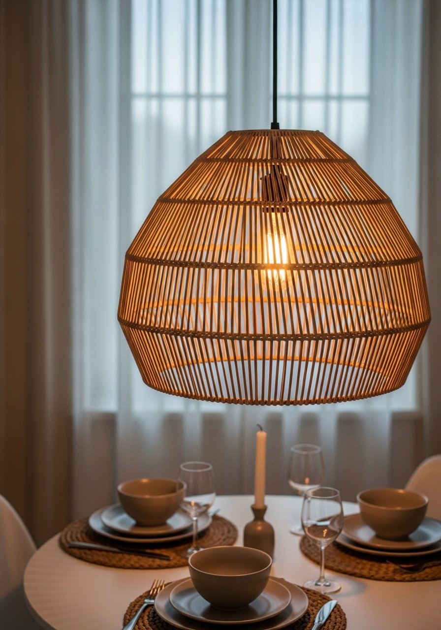 I hung a rattan pendant over my dining table and it softened the modern chairs. Natural materials are everywhere right now. Pair the fixture with warm bulbs and wood tones. Works in dining rooms and breakfast nooks. Budget $30 to $120. I swapped to a rattan pendant light shade and used LED Edison bulbs. Don't pick a tiny shade for a big table. Scale matters.