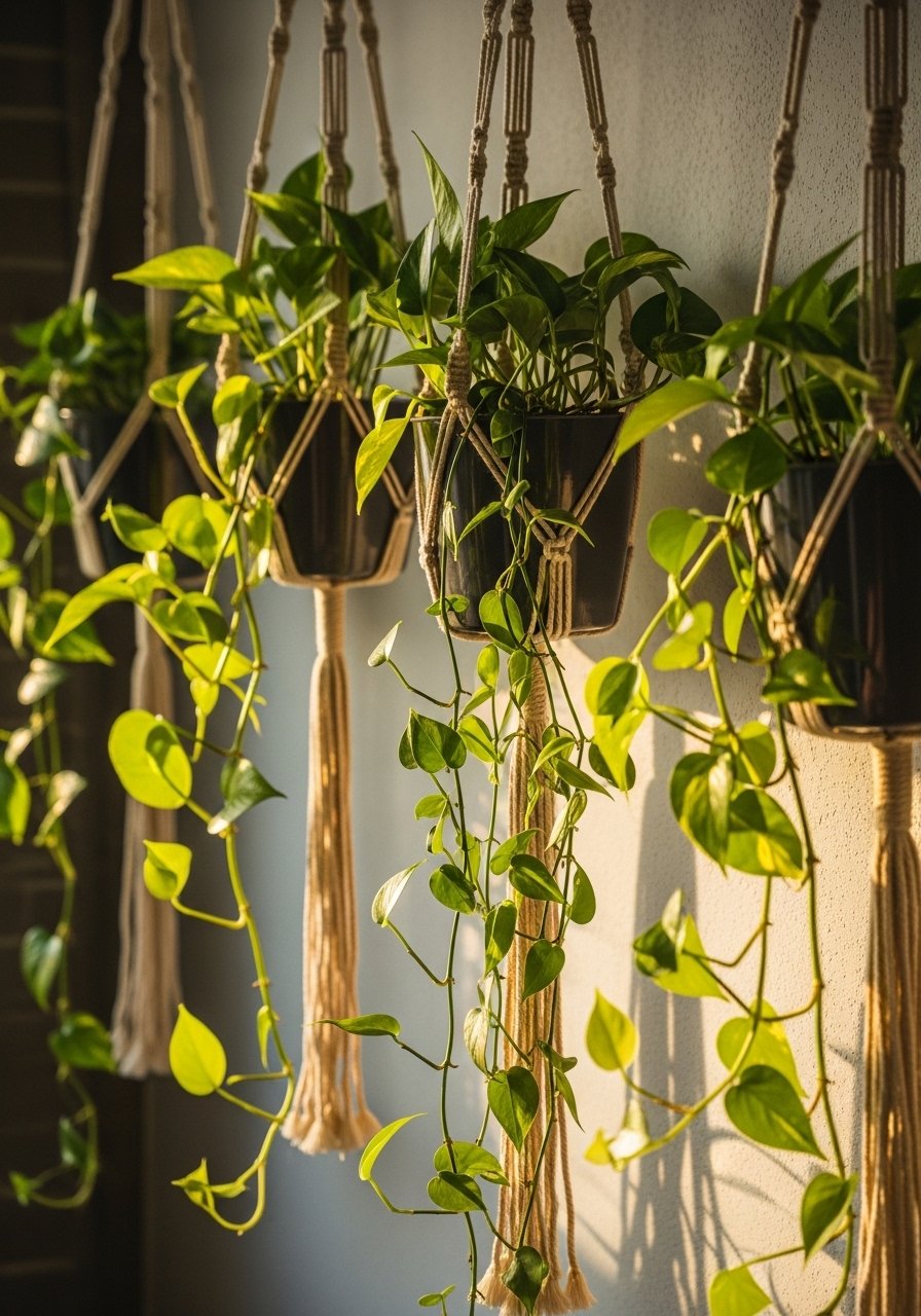 Hanging macrame planters added height to my balcony without crowding the floor. Use odd numbers and vary heights by 6 to 12 inches. Budget $25 to $60. I combined a set of three macrame hangers with faux plants for low maintenance. A common mistake is clustering at the same level. That looks amateur. In photos they look perfect. In my space I staggered heights for depth.