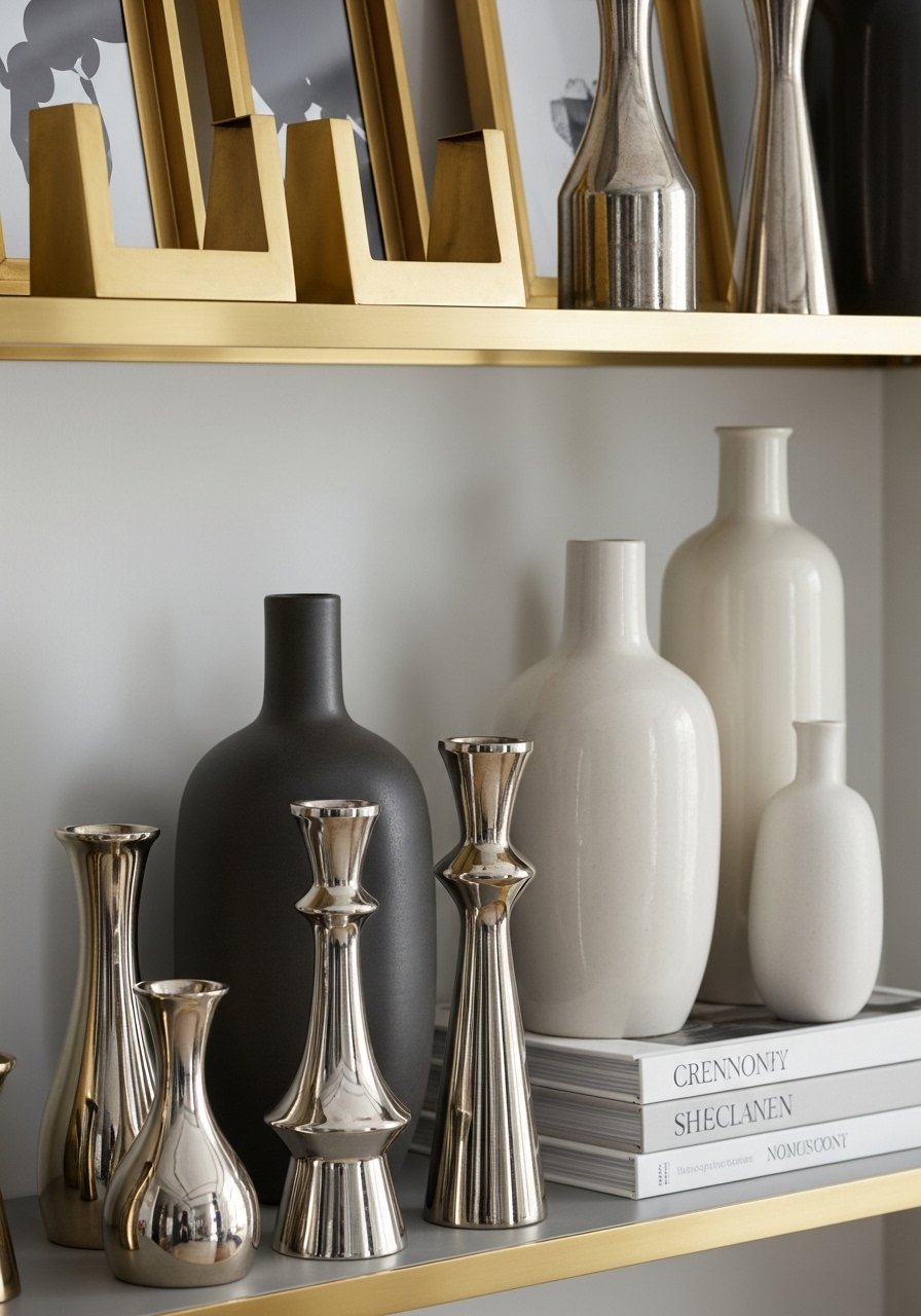 I used a mix of brass and nickel on a single shelf and it read intentional, not chaotic. Mixing metals is trending hard this year. Follow a ratio of one dominant metal, one secondary, and a small accent metal. Works in living rooms and bathrooms. Budget $20 to $80. I relied on brass picture ledges and a set of mixed metal frames. Avoid equal amounts of every metal. That looks busy.