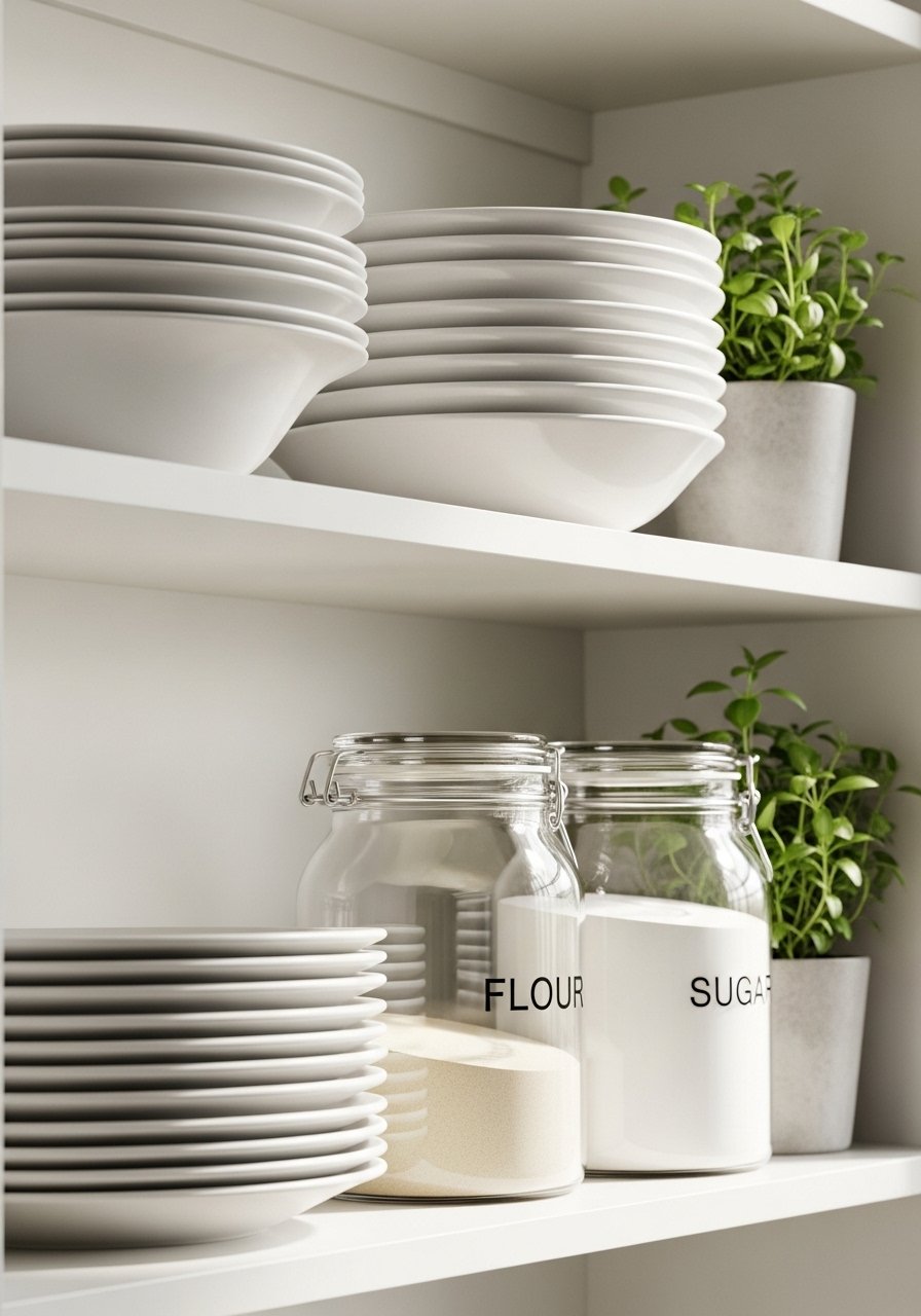 I removed one cabinet and installed open shelves. It forced me to edit what I own. Open shelving looks great in photos, but in my kitchen it demands daily tidying. Use consistent dishware and one statement piece. Works in kitchens and pantries. Budget $40 to $120 for shelves and brackets. I used white oak floating shelves and labeled jars reading 'Flour' and 'Sugar'. Mistake to avoid, mismatched plates in too many colors. Keep it cohesive.
