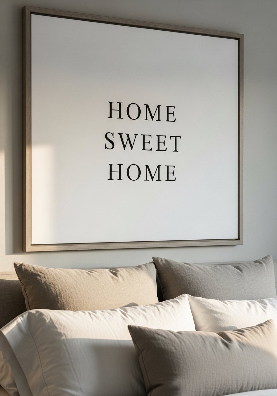 I leaned one large scale print above the bed and removed cluttered nightstand art. One bold piece brings calm. Use a 60-30-10 color balance across bedding and art. Best for bedrooms and guest rooms. Budget $40 to $200 for a quality print and frame. I used a large framed print with the words 'Home Sweet Home' and paired it with neutral linens. Avoid too many small pieces that fight the focal point.